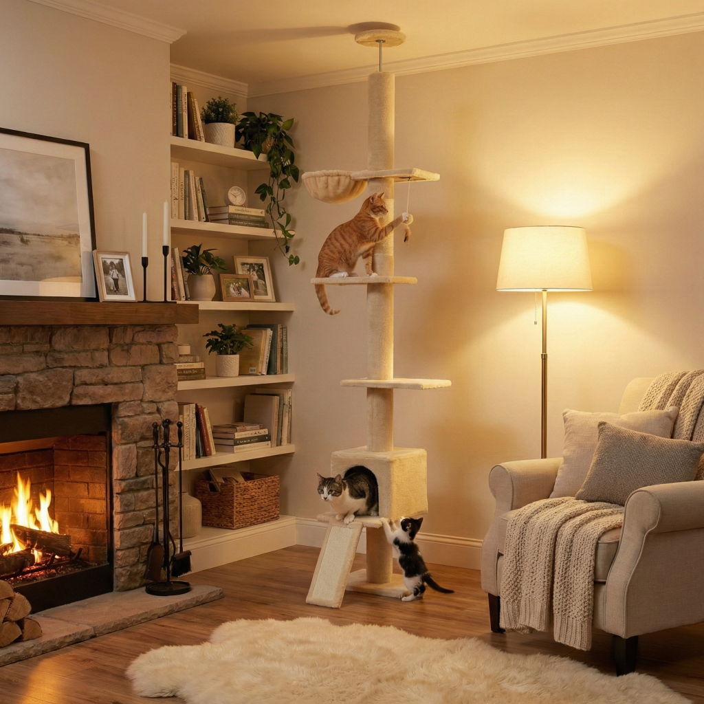 Cet arbre à chat est conçu pour l'escalade et le repos. Il utilise un système de fixation par tension (pression) entre le sol et le plafond par l'intermédiaire d'une tige télescopique ajustable. Ce mécanisme permet une installation sans perçage pour des hauteurs sous plafond comprises entre 210 cm et 274 cm.