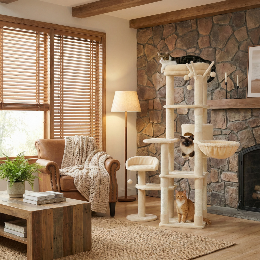 Avec ses 150 cm de hauteur répartis sur 5 niveaux, cet arbre à chat multi-niveaux constitue un véritable espace de jeu et de repos. Conçu pour accueillir 4 à 5 chats adultes simultanément, il offre tout l'espace nécessaire pour grimper et se détendre.