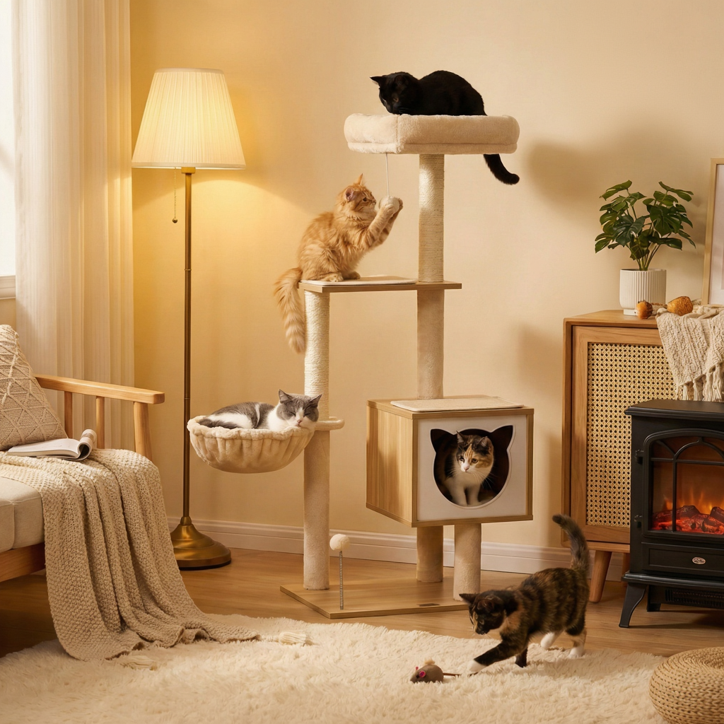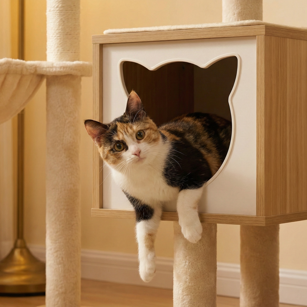 Arbre à Chat en Bois 126cm - Le Meuble Cocoon avec Niche Tête de Chat