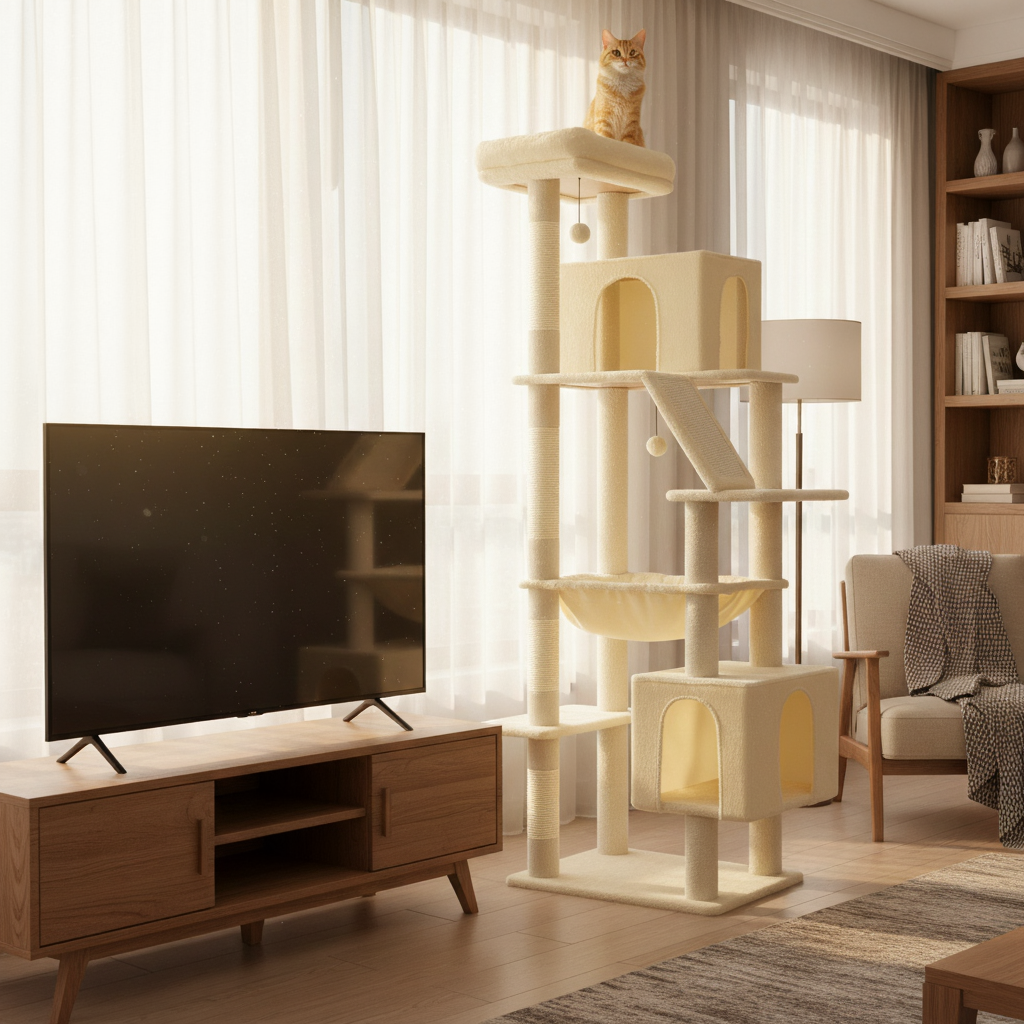 Cet arbre à chat de 180 cm de hauteur est conçu pour l'aménagement de l'espace intérieur de vos chats. Sa configuration sur plusieurs étages permet l'accès à différentes zones d'observation, de repos et de grattage.