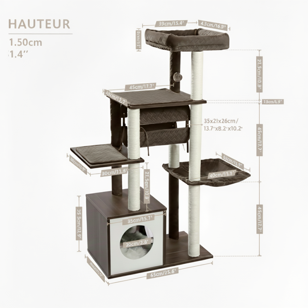 L'arbre à chat se décompose avec une niche cubique de 35 cm située à la base, servant d'espace clos. Les niveaux supérieurs intègrent deux hamacs en tissu type peluche et une plateforme. Les poteaux de soutien servent de zones de griffage, étant entièrement recouverts de corde de sisal.